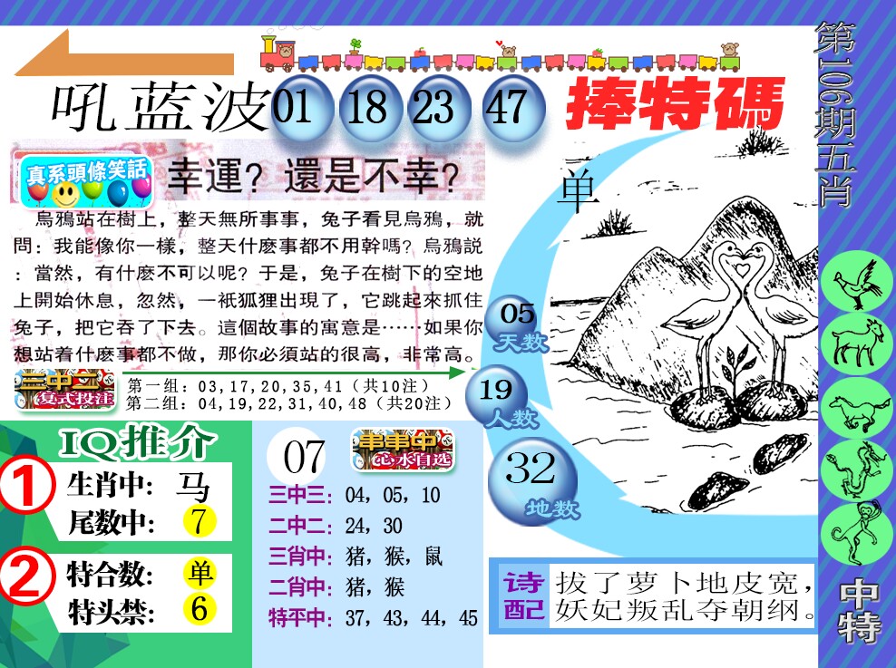 105期正版天机诗 送财送宝送到家 。送:蛇马羊鸡狗。 推荐:1 4 2头+蓝绿波(开兔40) |